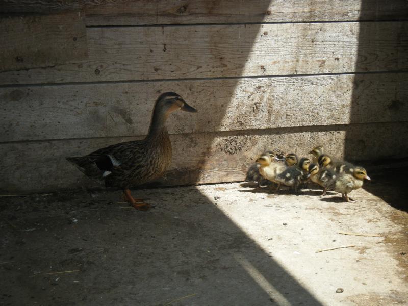 Se puso a incubar 15 huevos, y salieron 11. Uno de los patitos murio a los 3 dias, pero los otros estan de maravilla. Son diez preciosos patitos de anade real puro. Aqui las fotos: