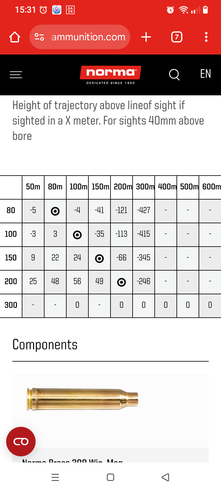 Segun esta tabla y teniendo el centro del visor 40mm por encima del centro del cañon. El punto de impacto tendria que estar 25mm alto a 50m.