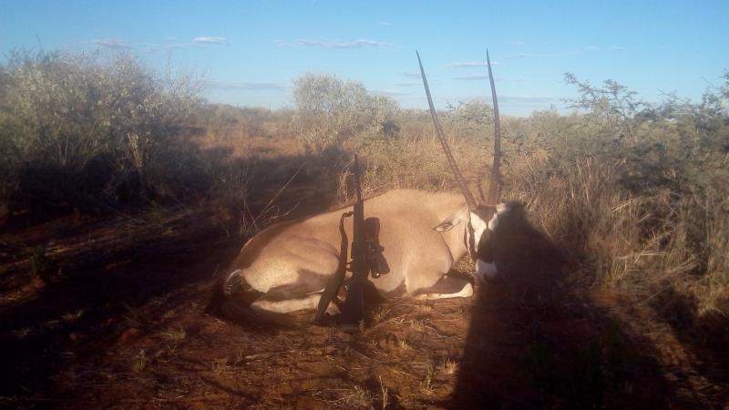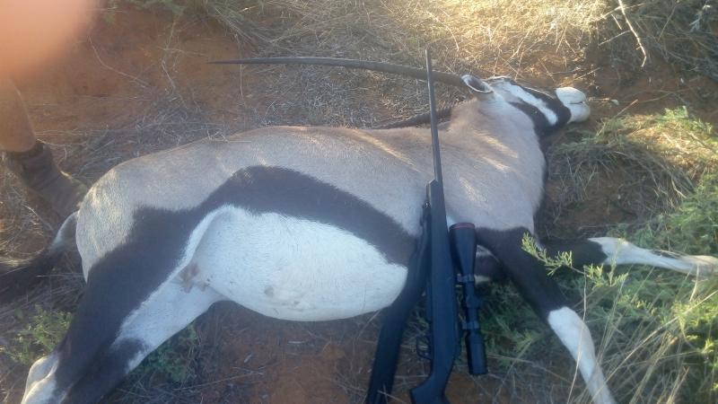 Hay está con mi winchester xpr, comprado para la ocasión, a la casa de la finca donde estamos cazando preparar los animales, comer, siesta y otra vez de caza, por la tarde hace menos aire y conseguimos hacercarnos a los oryx, me dice te da igual macho o hembra y le digo, si la hembra es buena si, no soy fanático de la trofeitis y además las hembras tienen los cuernos más largos aunque más finos y dónde la quiero poner, se va a ver mejor la altura que el grosor, al rato vemos una pelota y va una hembra que me dice que es buena, a unos 90 mtrs y muy tapada, pero se le veía el codillo, le tiro y me dice very good, efectivamente vamos a ella y está a 15 mtrs del disparo