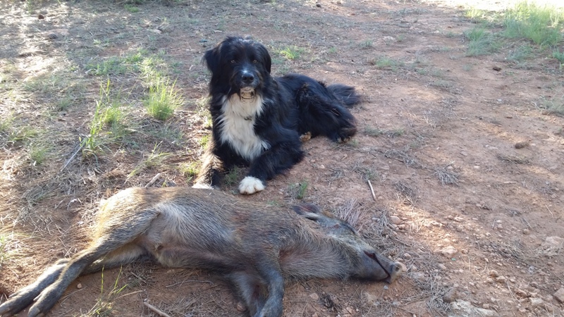 Resultado: el jabali dando vueltas y el perro encima de el.