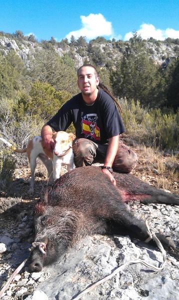 Como ha estado lloviendo el terreno esta blando, ideal para que los jabalis hocen con sus jetas en busca de alimentos, y también ideal para que nosotros veamos los rastros y para que los canes los sigan mejor, por ese circunstancia el día empezó bien, ya que nada mas soltar se empezaron a ver los primeros rastros frescos y los perros no tardaron en desaparecer para escudriñar hasta el ultimo rincón del monte, iba yo y un compañero de batallas monteando cada uno separado del otro unos 150-200m y ambos viendo mucha freza, decidimos seguir así hasta un punto en el que o han salido los jabalis o nos juntamos a replantear la estrategia, y para nuestra sorpresa nos tenemos que juntar a replantear la estrategia, le comento que a mi me faltan dos perros y que seguro que han movido los jabalis por detrás de nosotros y no nos hemos enterado y que los demás no paran de irse hacia un lado en concreto, y sabiendo que ellos son los que mas saben tendríamos que hacerles caso, así que nos ponemos en marcha hacia la dirección que marcaban los perros, y cuanto razón tienen los canes, no habíamos andado mas de 250m +- y ya se loes oye cantar un jabali, escuchamos atentos, pero no lo paran, se dirige ladera abajo a toda pastilla, salimos los dos como alma que lleva el diablo, mi compañero por la parte baja de la ladera, y yo por la alta, así le cortamos el paso vaya hacia donde valla, voy corriendo como un rayo y me paro a escuchar, aun llaten los perros no lo han parado, sigo corriendo unos decenas de metros mas y me pare otra vez, aun llaten, retomo mi carrera y al poco cambien los ladridos, me paro y efectivamente, ya ladran a parado, ya lo tienen, corro rápidamente hasta el lugar e la algarabía y me encuentro a las perros agarrando con fiereza a un gran jabai que se ha enculado en unos cinglos (riscos de piedra) y que retoma su paso lento gracias a los valientes perros que están agarrados de el y no le dejan moverse casi, al ver la situación me cuelgo el rifle, ya que un tiro en esa situación es impensable, y mientras me acerco a el voy sacando mi fien cuchillo y nada mas llegas agarro al fiero jabali con una mano mientras con la otra clavo el cuchillo utilizando todo el empuje de mi cuerpo para intentar tumbarlo y que no trate de huir, pero no hay forma, no puedo con el, pero la suerte ya esta echada, ya he introducido los veintipico centímetros de acero en su cuerpo y os muevo violentamente en su interior para que el destrozo sea mayúsculo y l muerte lo mas rápida posible, y así fue nada mas sacar el cuchillo los perros excitados por el olor a sangre se aferran al animal con mas fierza aun consiguiendo tumbarlo y arrancarla su ultimo aliento de vida, yo como el animal caigo al suelo exhausto por la carrera y reposo viendo como los perros descargan su furia en tan buen contrincante, que dio su vida pero no sin antes intentar llevarse la de algún can por delante.