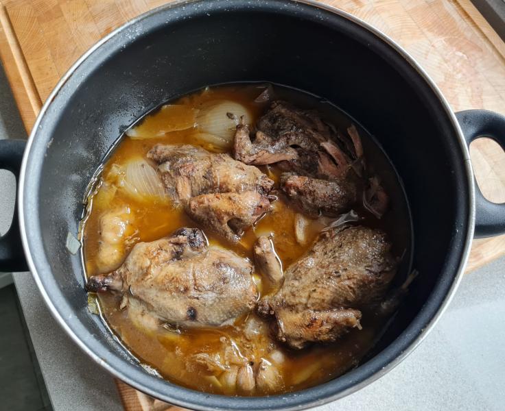 Aceite a la cazuela y sofreír bien las palomas hasta que se doren.