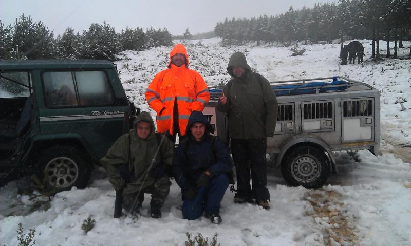 La mañana del sábado amaneció con lluvias, pero no nos quito la ilusion ni las ganas de salir, así que después de un buen desayuno y de esperar un poco a ver que hacia el tiempo, al ver que no tenia pinta de amainar decidimos hacernos al monte, nos tocaba montear la zona alta, y la sorpresa nos la llevamos al llegar y descubrir que allí la lluvia era nieve, esperas a que se coloquen los puesto y mientras tanto la nieve se fue acumulando y cada vez mas frío, pero los `perreros somos muy duros y un poquito de frío y nieve no puede con nosotros, pero por desgracia a los animalillos del monte no les debe de gustar mucho por que no sacamos casi nada, y lo poco que se saco fue por las zonas mas bajas, mis perros aun hicieron un par de carreras y poco mas, así que acabamos chopados hasta los huev... y un poco desilusionados (los bichos que se cazaron ya los dirá el compañero Gaallaecia que lo sabe mejor)