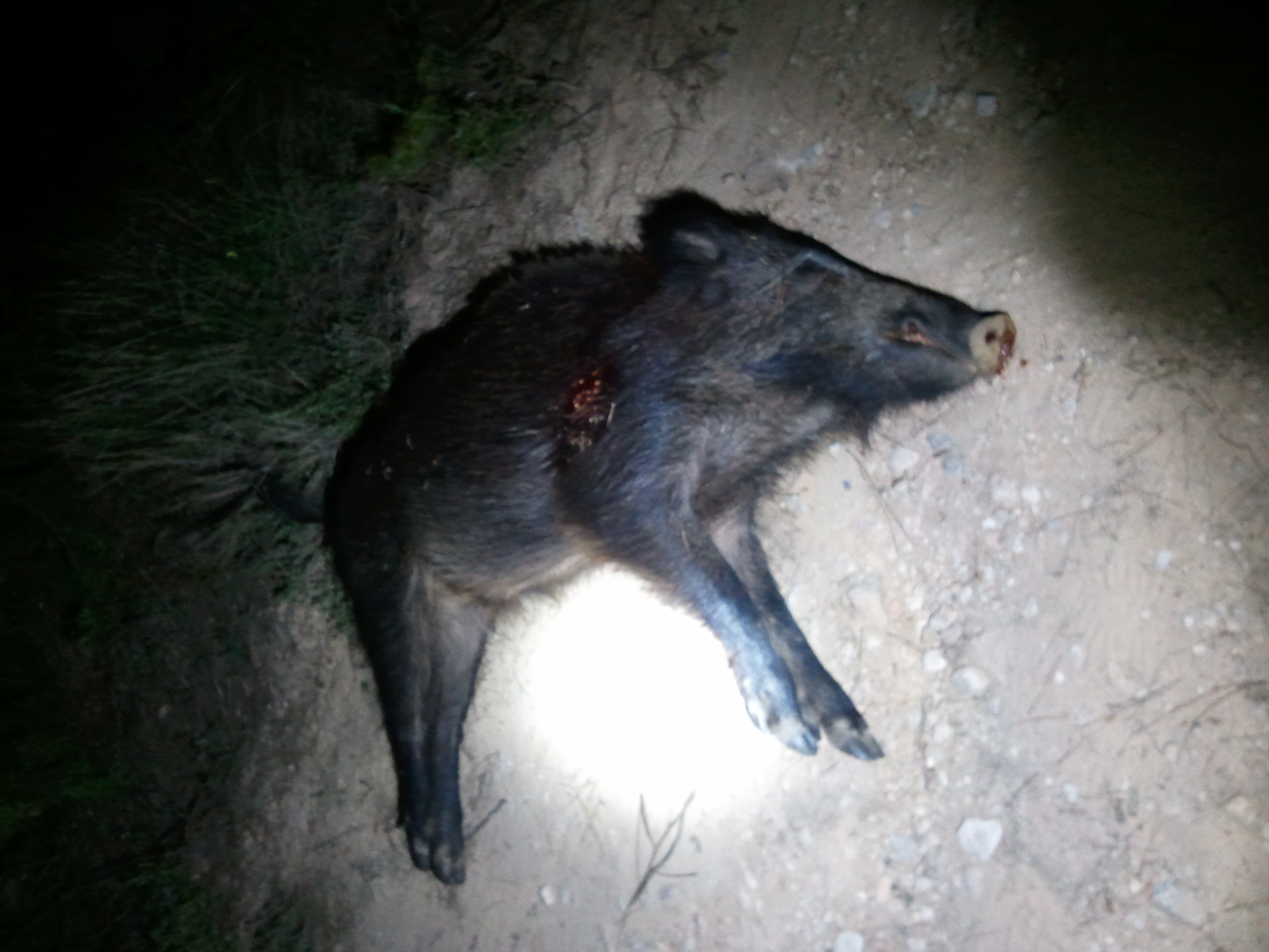 Os comento, voy a dar una vuelta a los cebaderos, con el fin de verlos y reponer un poco de comida, como no tenía nada mejor que hacer, después de cambiar cubos, limpiarlos, poner maiz, almendra, en fin arreglarlos bien para la campaña, pues hacía varios días que no los revisaba, una vez pisoteado todo el cebadero, decido sentarme un rato. Sobre las 22,00 horas, empieza la perritar a marcarme los olores del monte, yo pensando que venía un cochina con rayoncetes, pues el ruido era bastante grande. Ole sorpresa, 5 guarros buenos (machos y hembras), 1 guarra grande vieja -creo que bastante adelantada ya en su preñez- y un bicho con mas conchas que un saco de mejillones. Los dejo que se confien, buscando al grande que el cabroncete no salía del monte, sólo roncar y dejar que los otros se atracaran, en eso que localizo un segundo machete, ya cuando los tenía confiados veo al grande donde pensaba que podía tirarle, me lo encaro, enciendo luz y si quieres pies, menudo bufido y carrera, decido no tirar y esperar. Al cuarto de hora, nuevos ruidos y cochinos al cebadero, vuelvo a localizar a este machete y como el grande ya no volvía, pues le alivié de sus picaduras y miserias.