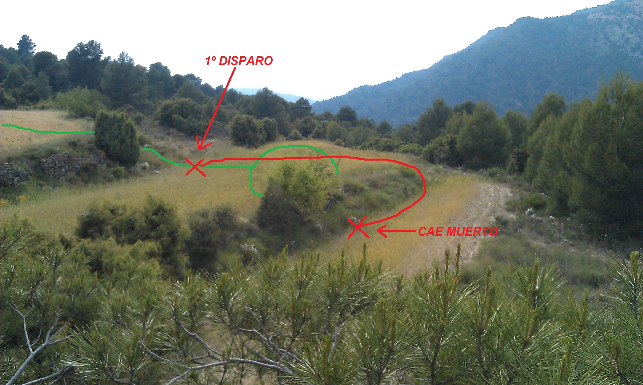Espero unos minutos en el pino para que las puercas llamen a los rayones y se marchen y bajo del pino en busca de mi padre, al llegar a donde el estaba me cuenta que al tirar yo le he espantado uno que lo tenia apuntito de entrar y me dice que si no lo he oído que ha venido hacia mi, hago memoria y si que recuerdo haber oído uno correr por detrás mío tapado por el monte. Después le cuento el lance y decidimos ir a buscarlos.