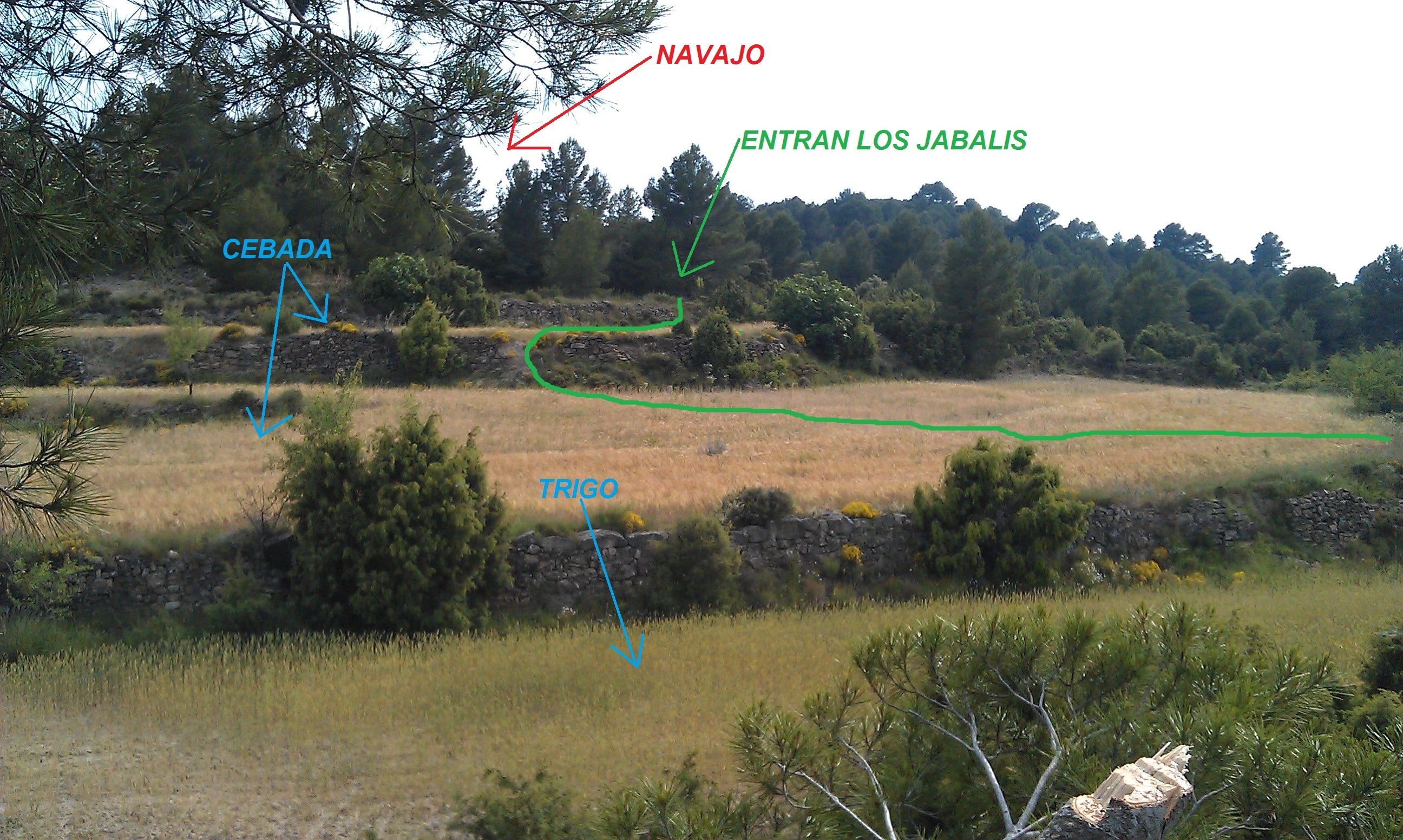 Después de unos 10 minutos, ya oigo claramente como se dirigen hacia los bancales que tenia a mi izquierda, yo estaba esperándolos en el ultimo de los bancales que estaban a diferentes alturas estando el ultimo, en el que yo estaba el mas bajo del todos, y al poco rato ya veo dos siluetas aparecer por la linde del bancal de mas arriba el que están mas cerca de la baña, y pienso que serán dos puercas con la cría, según entran en el primer bancal de cebada veo que por el monte por detrás de estos empiezan a aparecer mas jabalís, en fila india separados unos de otros por no mas de 2 metros, algunos iban en pelotas de 2 o tres y otros solos y en total mientras se acercaban al bancal que están yo el cual era de trigo sin rapa que les guata mas que la cebada, logra contar unos 10-12 jabalis mas unos cuantos rayones que no veía pero si veis como se movían las espigas a su paso, no lo tengo claro al 100% el numero de jabalis por que no dejaba de controlar los dos primeros ya que destacaban de los demás por cual serian las puercas, y los de detrás serien los del año pasado, pero mas de 10 grandes seguro.