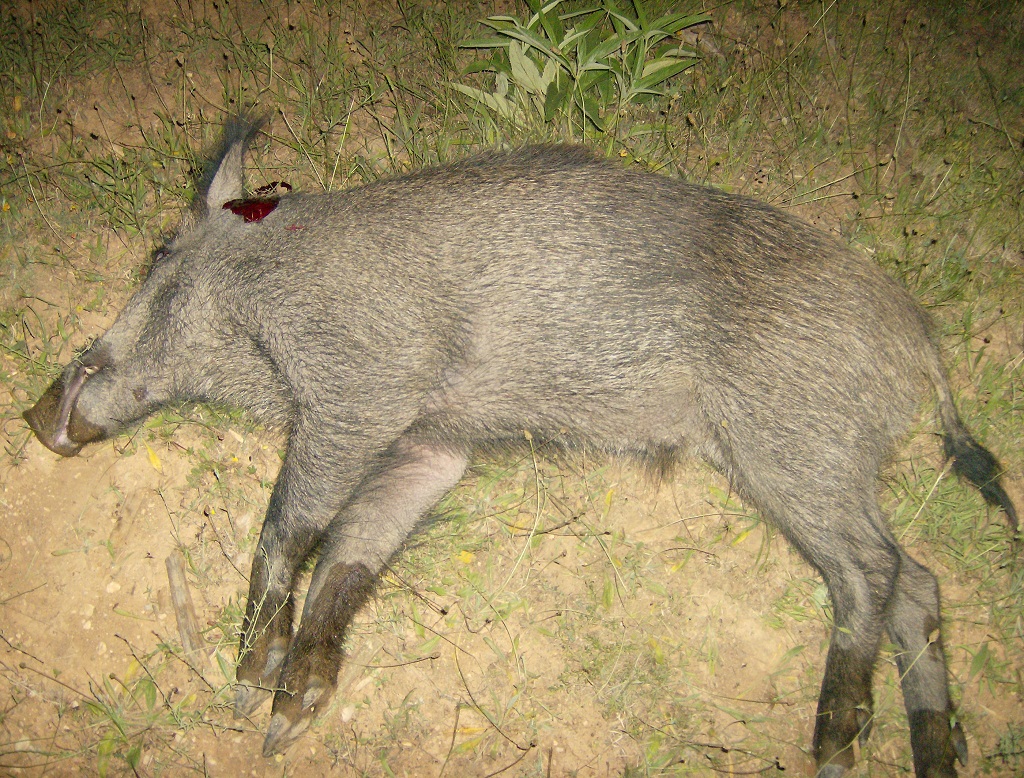 Como sabia que todos bajarían al trigo los fui dejando cumplir y decidí que dejaría pasar los primeros por estar casi seguro que serian hembras y así lo hice, llegaron los dos primero al trigo y los perdí de vista, tras estos entraron otros tres los cuales por la altura del trigo también perdí de vista, y entonces decidí que el próximo que bajara el ribazo hacia el trigo seria al que disparara me encare el rifle y con la poca luz que había ya que eran las 22:30 pasadas encare y de inmediato vi bajar uno el ribazo y se metió de lleno en mi visor, le coloque la cruz en la paletilla y dispare PUMM un estruendo recorrió todo el monte y todos los jabalís comenzaron su estampida, veo por el visor como sale polvo tras el jabalí y pienso que lo he fallado, e inmediatamente enciendo al luz y empiezo a buscar otro en el bancal de arriba, y nada mas enfoco a uno se para en seco y PUMM y este si lo veo caer seco, entonces oigo otro pasar casi por debajo del pino, me encaro lo meto en el visor, y veo que lleva dos rayones a su lado y que ademas va gruñendo llamándolos, lo sigo con el visor y veo que se para en la orilla del monte a unos 7-10m de mi y empieza a gruñir llamando a su prole, y decido no tirar por que obviamente es puerca.