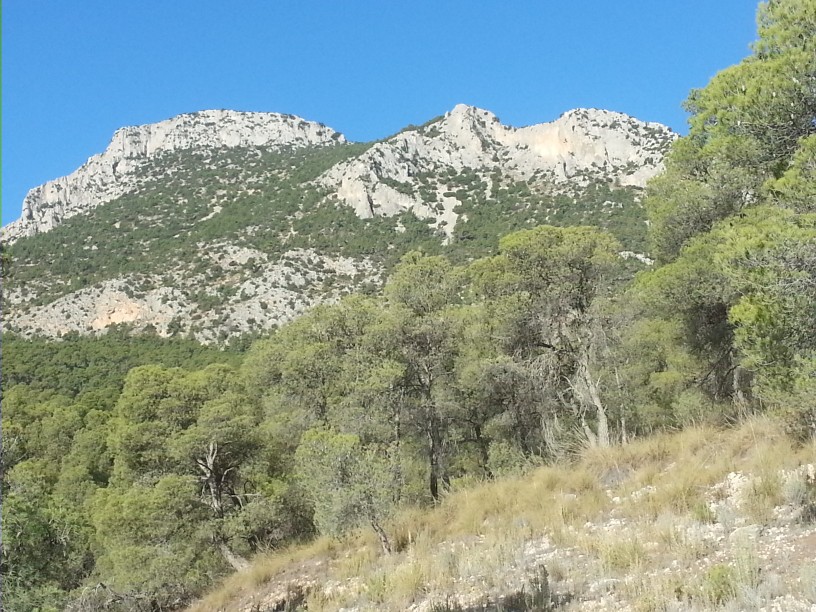 De aquí hacia arriba el coche ronronea trepando por la pista y paramos un instante para contemplar desde Pradolamina y ya a nuestra espalda la primera mole que hemos atravesado por la angosta carretera de las Bocas del Infierno, colgada sobre el río encajonado... Peñaforca.