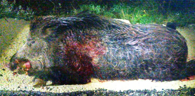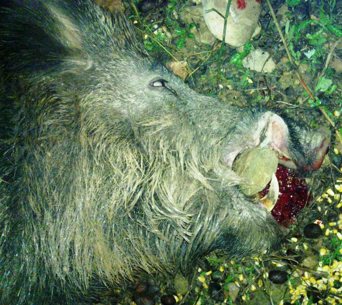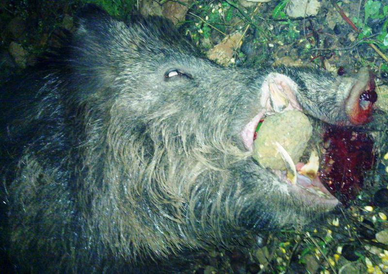 Tengo el placer de mostraros el MONSTRUOSO berraco que mi amigo Antonio cazó anoche. Salimos 3 amigos y únicamente él tuvo ocasión de disparar con su 30-06. El animál cayó sobre su propia sombra sin el menor pataleo; fulminado.