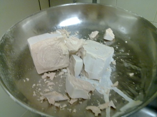 Cuando falten 5 minutos echaremos la levadura, en este caso de barra, mucho más fiable y conflictiva que la líquida o en polvo.
