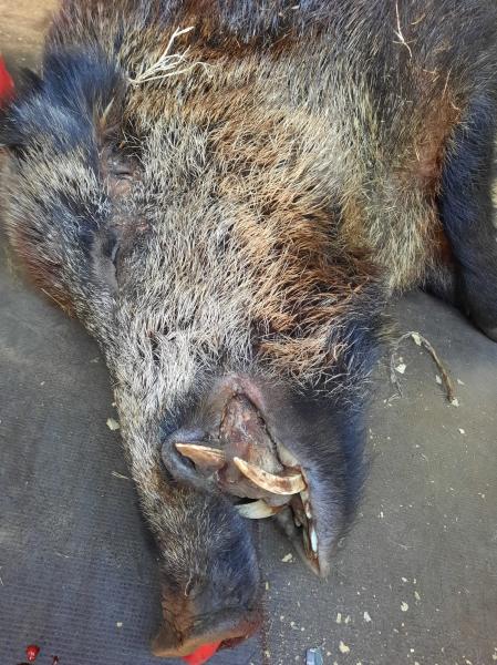En referencia a la foto de más arriba, dos jabalies tumbados el mismo día en la misma mancha hace unas dos semanas y dos bocas diferentes .