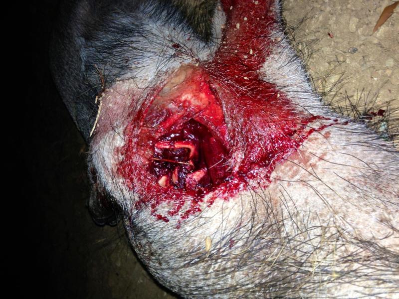 El caso es q la bala le ha dado en una paletilla y salido x la otra. Las dos patas delanteras se han quedado desarticuladas. No ha sufrido; ha muerto instantáneamente.
