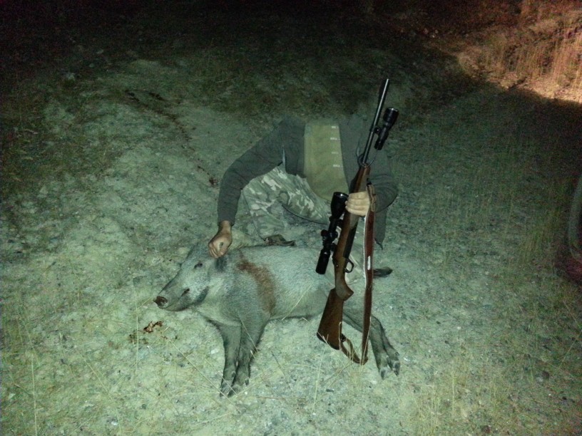 Sobre las 21:50 mas o menos con las últimas luces del día, aparece un machete de tamaño a esas luces bastante grande, entra direcatmente de frente a mi , por la presa y directamente al agua, entra en silencio, zorreando y se baña completamente en silencio y constantemente mirando al fondo y de frente a mi. Yo ya para ese momento ya tenia el rifle en posición por fuera de la ventada del puesto de esperas , pero mas quieto que una piedra.