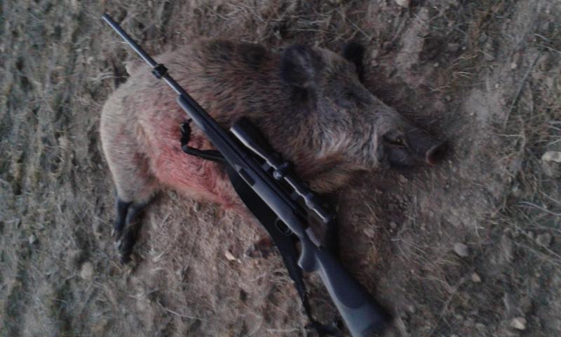 Asi fue, al rato entran 4 jabatos, ya de aproximadamente unos 40/45 kiletes y como por la mañana un amigacho me había pedido carne para hacerse un poco de embutido, aproveche el momento en que se cruzaron dos para darles caña. El primero quedó seco en el sitio, el segundo al romperle el tiro la columna, se quedó renqueando, así que me fui para él para rematarlo a cuchillo y el muy jodido, me pilló la perra y le ha causado daños en una mano y a mi casi me muerde, hasta que pude montarme encima de él y clavarle el cuchillo, (mala suerte que no hubiese nadie para gravar el lance).
