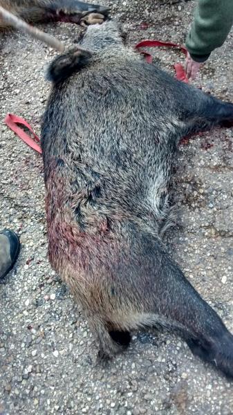 Yo me estreno con calibre , rifle y recarga después de mucho jaleo de tiros y carreras de puestos contiguos me entraron dos jabalíes con intención de saltar a unas tierras pero al verme se volvieron, pudiendo tirar a la primera un tiro solamente quedando este algo trasero pero mortal, pues no andaria mas de 25 metros.