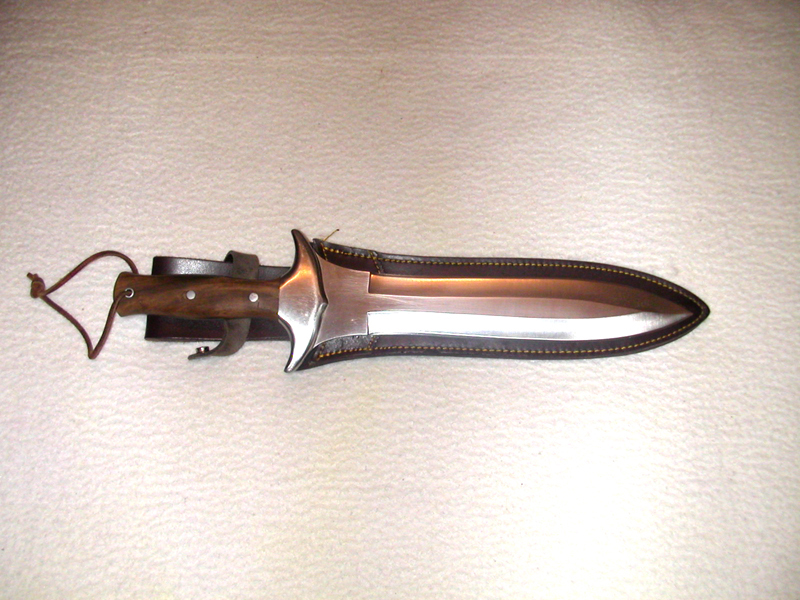 Este es un desollador, que fabrique yo mismo, la hoja es de acero rápido (cada taladro del mango me supuso tener que calentar la hoja al rojo cereza, para taladrarla y estropear una broca en cada taladro), el mango y la funda de mansonia (una madera de origen africano), la hoja es muy difícil de afilar por su dureza pero después es capaz de desollar varios jabalís sin afilar