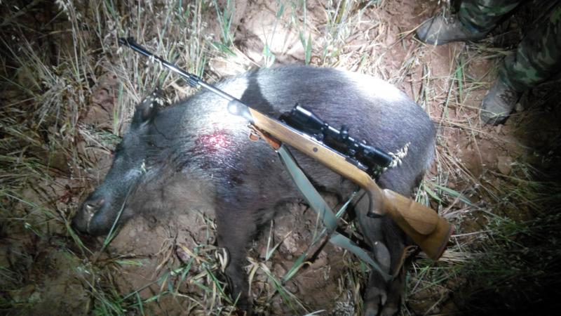 Estaba bastante fijo en una charca, pero no para bañarse, por qué no se bañaba, si no para recorrerse toda la orilla en busca de cangrejos. No me pude poner en la charca por qué el aire me venía mal, si no ha 50 metros de la orilla de ella y solo lo podía tirar si el bicho salía para fuera y por el lado donde yo estaba puesto, estaba difícil ya qué la charca era grande y desde fuea no se veía ha tirar y al entrar a ella tampoco lo podía tirar puesto qué entraba por un camino tapado de pasto zarzas etc. Ha las 12:30 escuche un pequeño gruñido por el camino y después el sonido de la alambrada al pasar por ella, no había duda aquí estaban, pero sería una manada o el bicho grande, al rato lo pude comprobar por qué no sonaba los típicos gruñidos de bichos chicos, iba para allá para acá pillando los cangrejos, y yo mientras escuchándolo como los roía, en un momento parece qué olió algo raro y bufo pego una carrera y lo deje de escuchar durante un rrato, tenía pocas esperanzas, ya había pasado una hora desde qué llego, cuando por el rabillo del ojo izquierdo veo una cosa mu negra y grande a unos 50 metros, enciendo la linterna apunto y el verrido del 300 me sorprende, al llegar a el no me lo podía creer vaya alegría y qué bicho he abatido como un ternero, no dijo ni pio las remington accutip 180 grains se comportaron de lujo