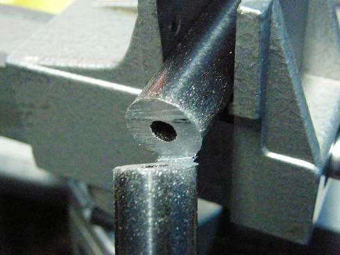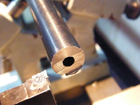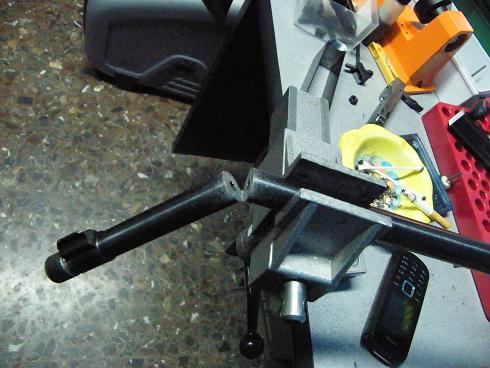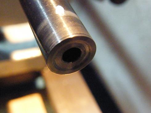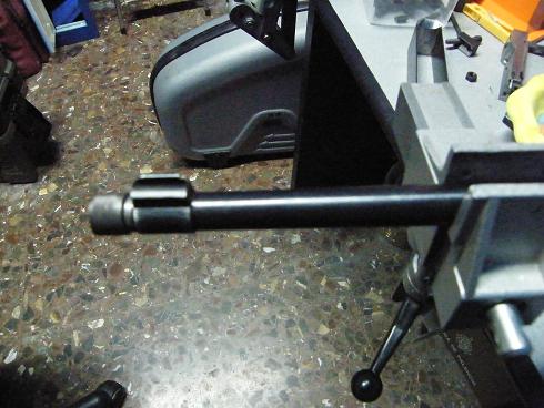 Una vez en casa y tras limpiar a fondo el cañon vi el "problema", mi padre la llevo a roscar el cañon a uno de tantos grandes armeros que hay por este pais, este en lugar de quitar el punto y roscar se le ocurrio taladrar un trozo del cañon y meter un casquillo soldado con laton; el sistema no es malo ya que consevas el punto, pero si haces el agujero desplazado respezto a las estrias puede pasar cualquier cosa como he podido comprobar, cuando se acumula mugre(polvora y plomo) en el casquillo las balas rozan en el, de hay que me halla decidido a pegarle un corte.