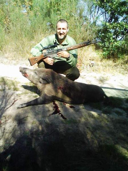 Al rato de empezar se oye por la emisora que los perros de mi derecha habían sacado un jabali, e inmediata mente dicen que iba hacia mi, y de repente por de tras de mi a unos 20m ya oigo pasar a los perros y veo como bajaba por la montaña el jabali, aviso al compañero de mi izquierda que estaba ahora en la parte de abajo de la montaña casi en el barranco, diciéndole que le iba directo, yo no podía tirarle por que llevaba a todos los perros tras el, y al compañero la pasaba lo mismo, pero como el jabali iba directo a el cuando le pasa a unos 5m le tira, pero nada, y empieza el jabali a subir por la umbria con todos los perros tras el, yo que lo veo subir lo encaro pero tenia a los perro s demasiado cerca para dispara, y ademas cada vez se acercaban,mas, y a mitad de la montaña ya se hacen con el, lo agarran, el jabali se defiende y como ve que para arriba no puede ir pues para abajo, y yo que veo que va hacia el barranco empiezo a correr, por que no habia podido deshacerse de los perros y estaba claro que en el barranco lo agarraban, al llegar yo al barranco ya veo que lo tenían agarrado, y faltándome dos metros para llegar al jabali,llegaba el compañero que iba a mi izquierda, saca el cuchillo para pincharle, y yo me paro y me dispongo a sacar el móvil para grabarlo, y en eso que el jabali pega una espantada, y tira a mi compañero al suelo y el cuchillo sale por lo aires también, yo al ver como estaba el percal, suelto el rifle cojo el cuchillo (hoy llevaba en vez de mi cuchillo artesanal la bayoneta del CETME cojo al jabali de los pelos del lomo y le pego cuchillada, pero sorpresa, la PU... bayoneta no le entraba, lo vuelvo a intentar y nada, se pone un perro a agarrar donde yo le intentaba clavar el cuchillo y yo me cambio de lado e intento otra y otra y otra vez clavarle la PUTA bayoneta, pero nada, ya arto se la apoyo en el costado y empujo con las dos manos pero increíble no se le clavaba, echo todo mi peso y en vez de clavarsela, lo que consigo es tumbar al jabali y al ver que lo habia tumbado, me apoyo con una rodilla en los jamones del jalali para que no se levantara y sigo apretando con las dos manos la bayoneta sin conseguir nada, y como veía que no se le clavaba, le digo a mi compañero que le pinche que el mio no va y mientras yo lo aguantaba tumbado le ha clavado el su cuchillo y fin de la historia.