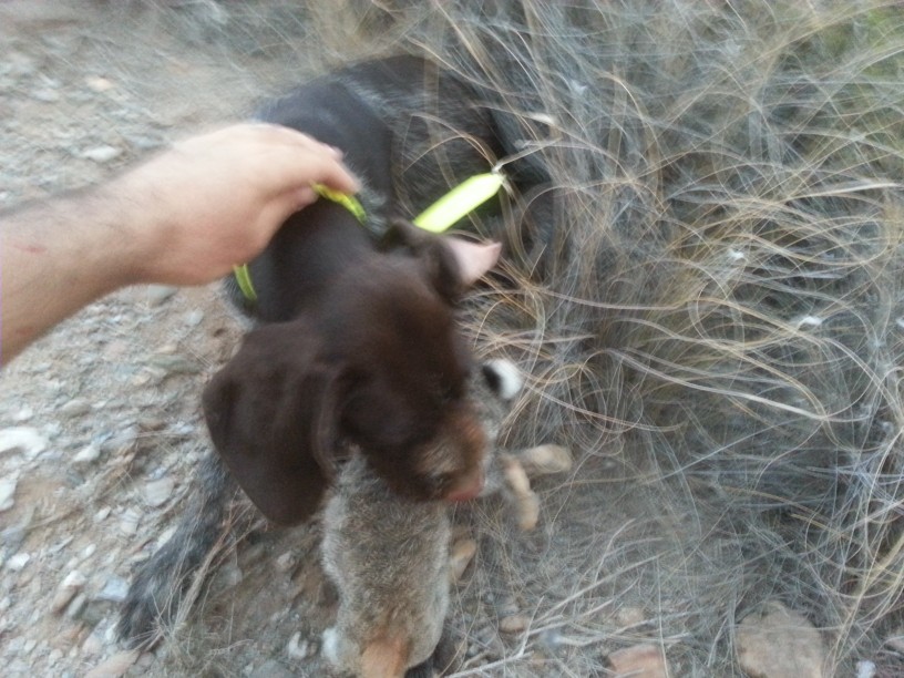 Aqui teneis a su hermana que con sus 5 mes ya ha cazado mostrado y cobrado su primer conejo. Despues de cazar otros 4 acompañando a su madre. Creo que dará muchas alegrías a su dueño.