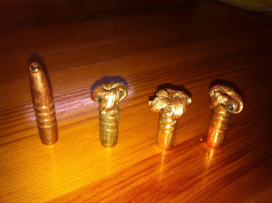 En la foto os muestro algunas de las puntas que pude recuperar. Como podéis ver todas las que recuperé abrieron correctamente excepto una. Esta punta que no abrió fue recuperada del primer animal que cacé, un Red Hartebeest. Como explicaré en próximos post, a este animal le tuve que tirar a 330 m. cuando estaba de frente mirando hacia nosotros pero ofreciendo ligeramente su flanco izquierdo. La bala penetró cerca de la paletilla izquierda y se alojó cerca de la piel delante del muslo derecho. ¿Por qué no abrió? Pues no lo sé. Los expertos dirán.