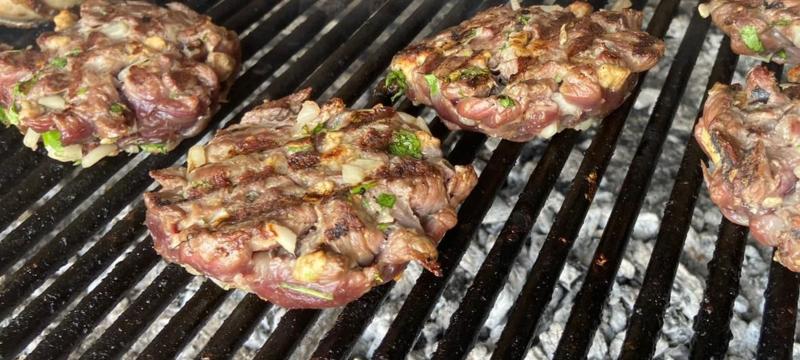 El ciervo de esta semana, al estar encendido dejamos la carne en leche unas horas y luego, al cortar la carne le meto un limón, sal y ajo para macerar. Hacemos la hamburguesa echando cilantro, cebolla y un poco de manteca de jabalí, y al fuego directas.