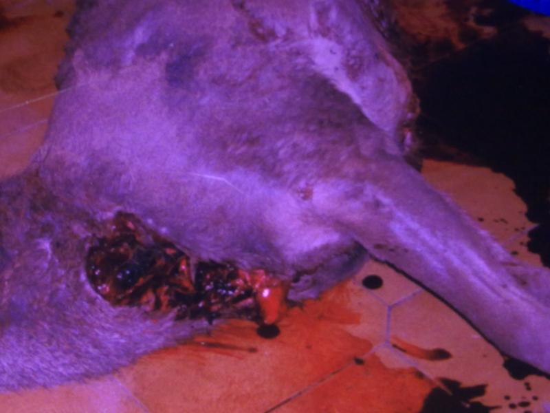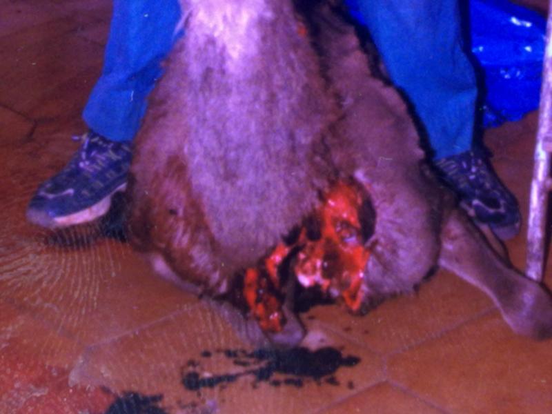 El tiro le entro por el agujero del culo, destruyo casi toda la columna vertebral, y salio por delante como podeis ver;el animal pesaba 160 kilos.