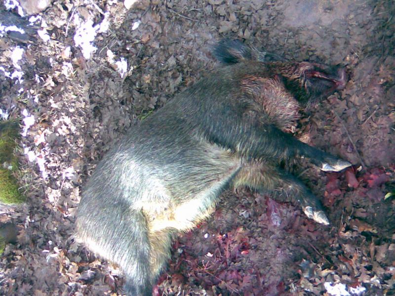 Total que en cuanto empiea a moverse la gente, tiro para abajo a ver si hay sangre o qué y veo que si, hay esta no se ha movido ni un palmo, es una jabalina y me imagino que lo que salio corriendo era una cria que estaria alli con la madre y no la vi al entrar y al no verla bien al salir no me di cuenta de que era más pequeño.