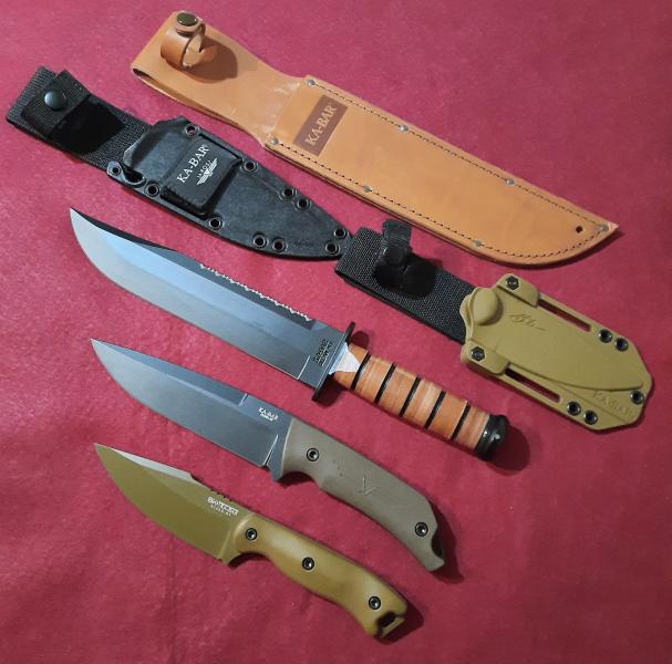 Cuchillos que van muy bien son los Kabar por su variedad y por su acero muy cómodo para trabajar con ellos, de precios no se pasan, mis últimos tres de la marca te paso fotos.