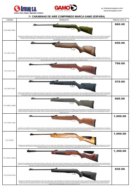 Hola, recibí un rifle de aire comprimido de la marca Gamo por regalo, necesito saber cual es su modelo pero no encuentro la caja ni nada. El rifle perteneció a mi padre cuando era un chaval (1980 mas o menos) sus caracteristicas son una mira abierta, una culata de madera igual a la de un ak 47, no es coml los rifles modernos que la culata tiene una especie de forma rara, esta culata es triangular por asi decirlo, el gatillo es normal, como el de una pistola, si teneis dudas respondere.
