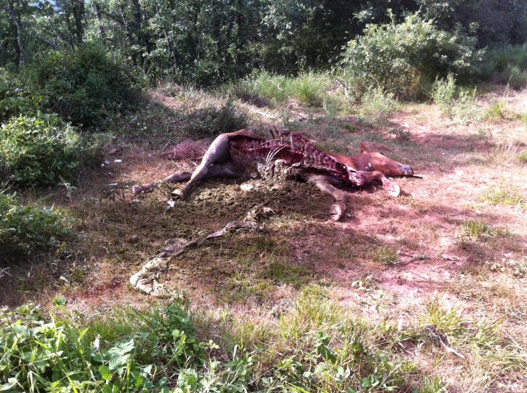 Ayer me avisaron de que los lobos habían matado una potra de 2 años en mi coto. Cuando llegué no tuve problema para encontrarla, había como 50 buitres planeando encima y unos cuantos comiendo.