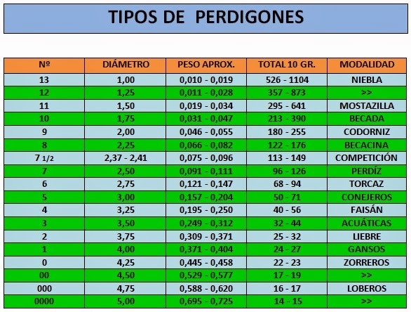 SicariuS escribió:Hola, que opinais de esta lista de perdigon segun numero y la recomendacion que hace de lo que cazar con ella.