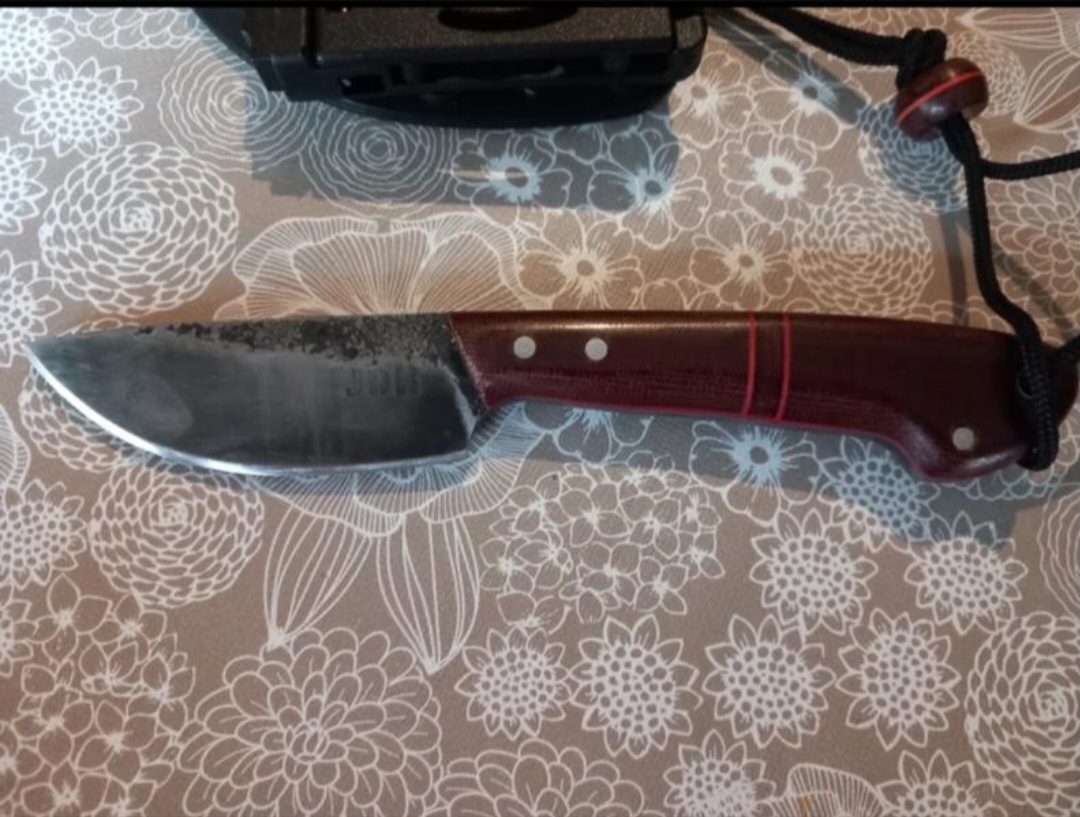 Cuchillo nuevo sin estrenar del prestigioso forjador JD Knives, 19,5 de largo, mango 11,5cm, 8cm hoja, 4,5mm grosor. Funda con posiciones múltiples para cinturón.