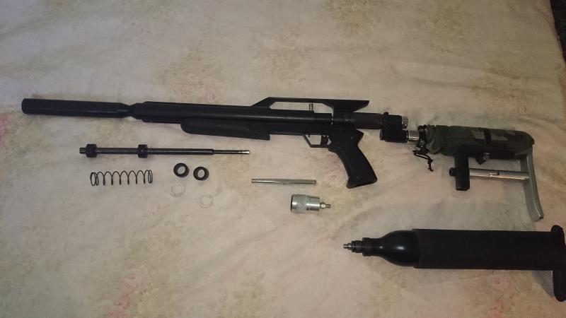 Tiene su depósito original y otro tipo paintbal con una z artesanal con regulador,válvula on-of,indicador de presión del depósito y también indica la salida del regulador,la cual tiene instalado una válvula hi flow.
