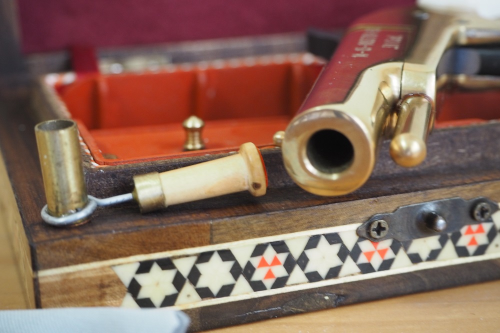 Cambio esta magnífica Derringer de avancarga con sus accesorios en caja de madera (taracea artesanal) por carabina de precisión de AC. Busco una histórica. Una pieza exclusiva de coleccionistas única con esta presentación.