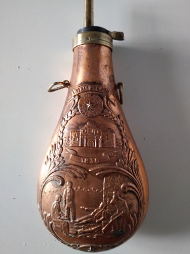 Polvorera fabricada a mediados de los 60 muy bien conservada, realizada con piezas de bronce y cobre con boquilla de medidor de cargas en buen estado y asas de bronce para colocar correa y colgar, sus caras están decoradas con trabajados en relieve de la batalla de san Jacinto 1836 la lucha de independencia de Texas. Sin contar la boquilla mide 17, 5 cm de largo * 9 cm de ancho. CAMBIO por otra Polvorera más chica en mismas condiciones de conservación.
