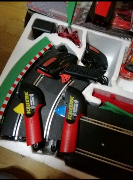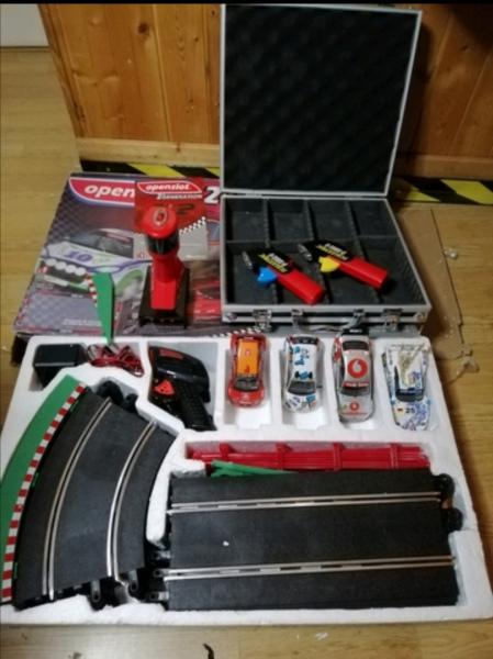 Cambio circuito OpenSlot (adaptable a Scalextric) circuito forma de 8 en su caja, más 2 mandos con cable alimentador, también pista y alimentador Scalextric con base inalambrica 2 mandos incluidos, 4 coches Scalextric, más maletin para 8 coches, por carabina del 6,35 o material de airsoft, que me pudiera interesar, interesados dejar mensaje.
