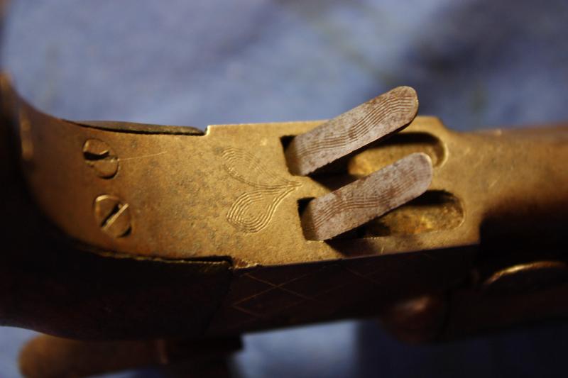 Buenas tardes a todos, bueno ha llegado a mis manos una pistola lefaucheux. He medido el interior de los cañones y me da unos 12mm, he estado buscando unos marcajes a la pistola y de momento solo he encontrado de bajo del cañon una inicial grabada, lo que parece ser una "S", ¿esto es posible?¿significa algo? si no significa nada creo que pudiera ser la inicial del apellido de donde procede el arma.El arma mecaniza perfectamente( no quiere decir que vaya a disparala).Tiene grabados los gatillos y parece ser que tiene los cañones marcados con con un 1 y 2. ¿ Alguien me puede decir algo mas de esta pistola ? Tengo otra pistola lefaucheux en casa y la verdad que hay algunas diferencias.