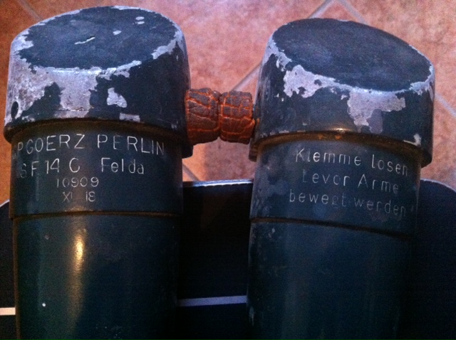 En principio es un periscopio de la marca GP Goerz Belin, modelo SF 14C. Junto a estos datos, aparece la palabra "Felda", "10909", y "XI 18". En la otra lente, viene escrito "Klemme Losen Levor Arme bewegt werden". En la parte inferior de una lente viene la cifra "485065".