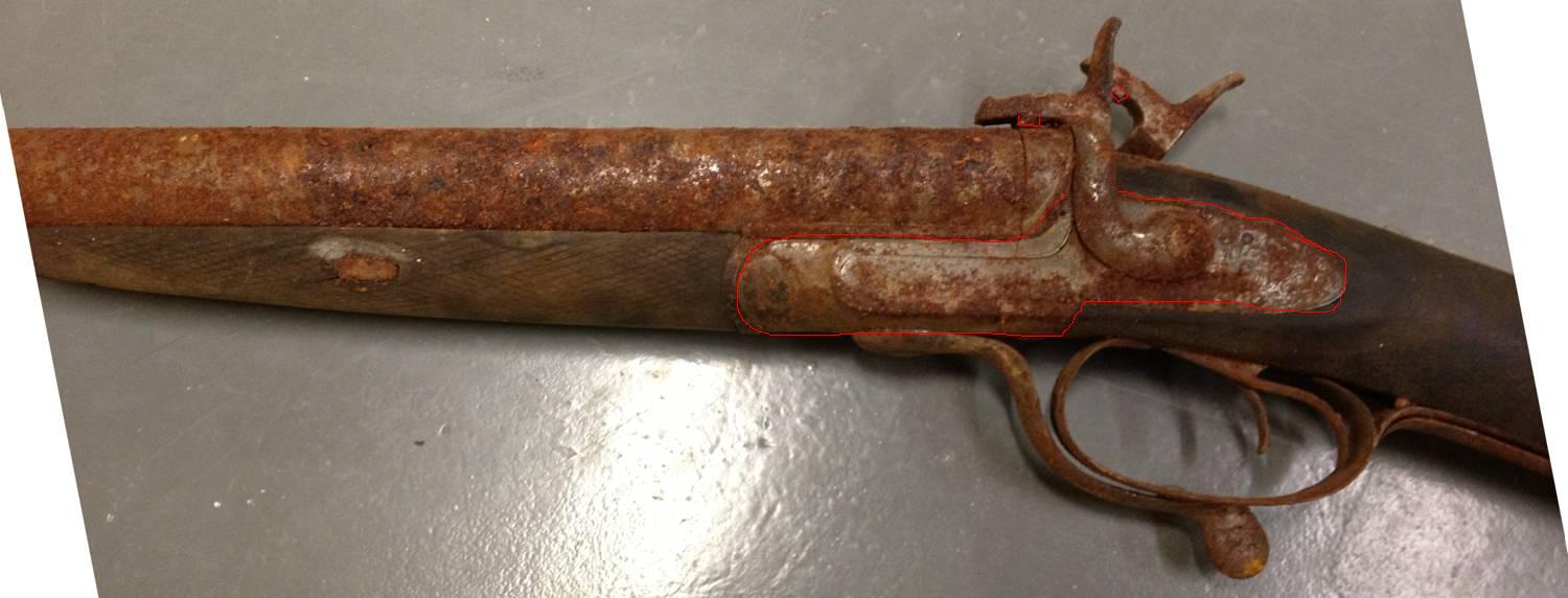 Lo que está claro es que se trata de una escopeta de cartuchos cal. 16 tipo lefoucheaux (de espiga) posiblemente de finales del siglo XVIII, tengo una inutilizada un poco mas moderna, mismo sistema de palanca de apertura, perrillos fuera, mismo calibre pero de fuego central.