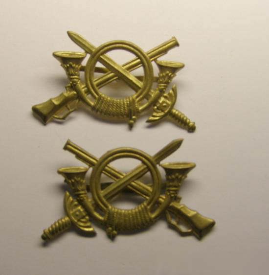 Es un emblema de infantería del modelo de 1925, pero sin corona, osea que o bien se la quitaron o ya fue fabricado sin ella durante los primeros tiempos de la República.