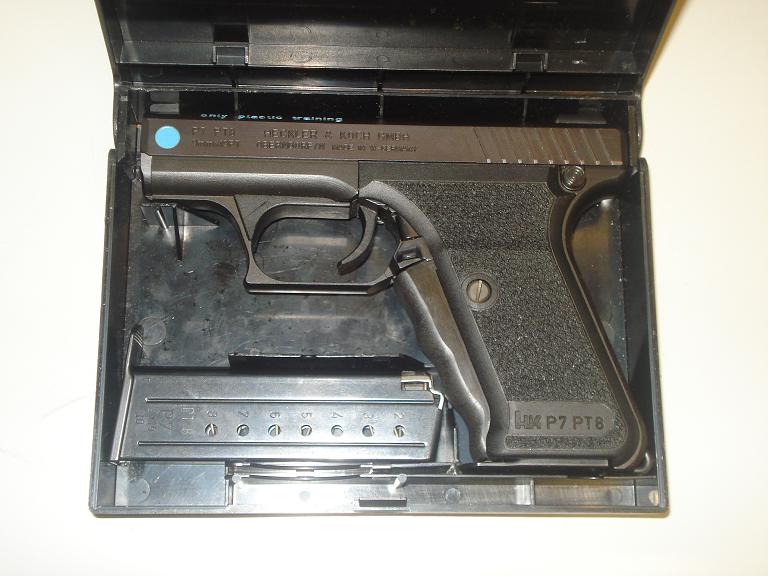 Por lo poco que he visto, la P7PT8 es una de las muchas variantes que existen de la P7 y una de las más raras. Según parece se hicieron únicamente 187 unidades entre los años 1.982 y 1.983. Es una P7 de entrenamiento a la que han modificado sus mecanismos (está al parecer dotada de una especie de recámara flotante o algo parecido cuyo funcionamiento no alcanzo a entender; estaría bien poder ver unas imágenes del despiece de la tuya) para poder ser utilizada con unos cartuchos de calibre 9 mm parabellum especiales que fabrica en plástico la firma Geco (PT significa "plastik training"). La modificación según parece está hecha para que aparte de poder disparar estos cartuchos el arma sea además capaz de mecanizar e introducir un nuevo cartucho en la recámara tras cada disparo, ya que he visto un video en el que un individuo tirando estos cartuchos de plástico con otro modelo de pistola tiene que ir montándola a cada tiro que realiza para poder seguir disparando, ya que la corredera no tiene la suficiente fuerza para poder llegar a su posición más retrasada.