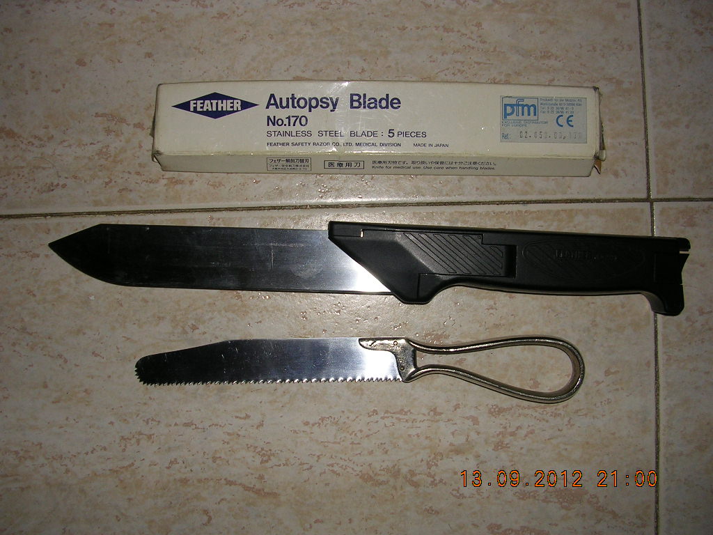 De los dos cuchillos, el de arriba es de hacer autopsias y el pequeño de sierra es de amputaciones para uso veterinario y supongo que también para personas.