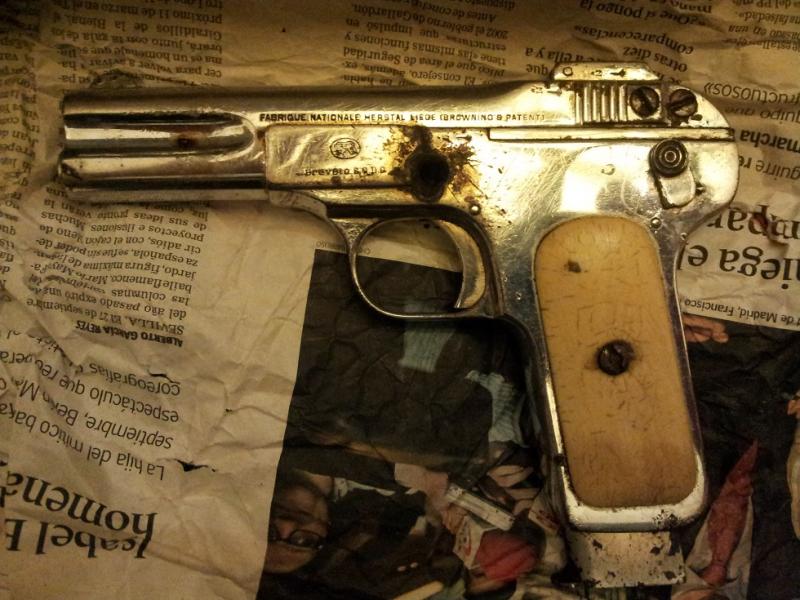 La pistola es una belga Browning FN Modelo 1899 en calibre 7,65 mm.