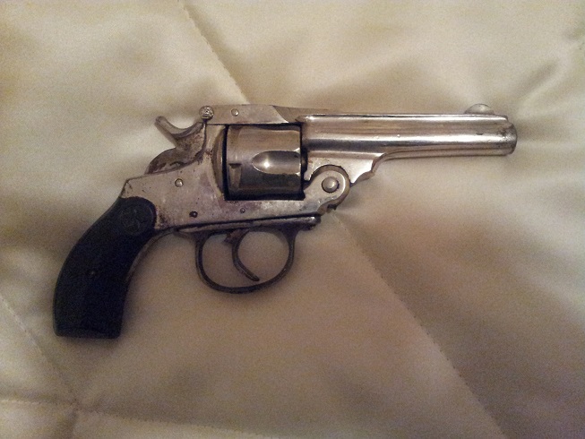 El revólver es un Euskaro, seguramente en calibre .38, copia española fabricada en Eibar del modelo de Smith & Wesson First Model Double Action DA.