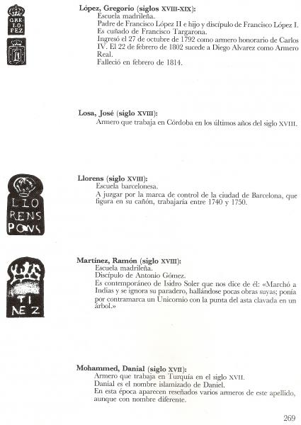 Casariego también hace una enumeración de las marcas de los armeros españoles de los siglos XV-XVIII y muchos de ellos tienen verdaderos apellidos catalanes, Prat, Armanguer, Coma, Mas, Esteva, Rovira, Pere Carbonell ( que inventó el revolver con llave de Miquelet en 1.702 ), Soler, Eudald Pons, Llorens, etc..