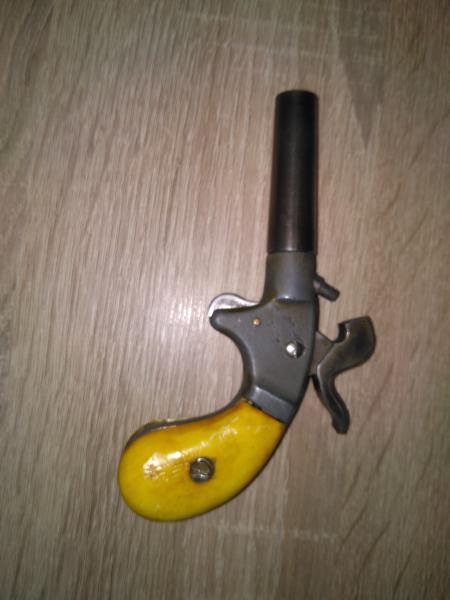 un buen amigo ha comprado este cacharrillo y me ha pedido a ver si puedo averiguar algo de el,no puedo saber el calibre porque esta obturado el cañon ...la verdad es que parece de juguete y el cuerpo no es de hierro (solo el cañon),por lo que presupongo que debe ser alguna imitacion,replica o fabricacion relativamente moderna...las cachas son fabricadas (parece hueso)