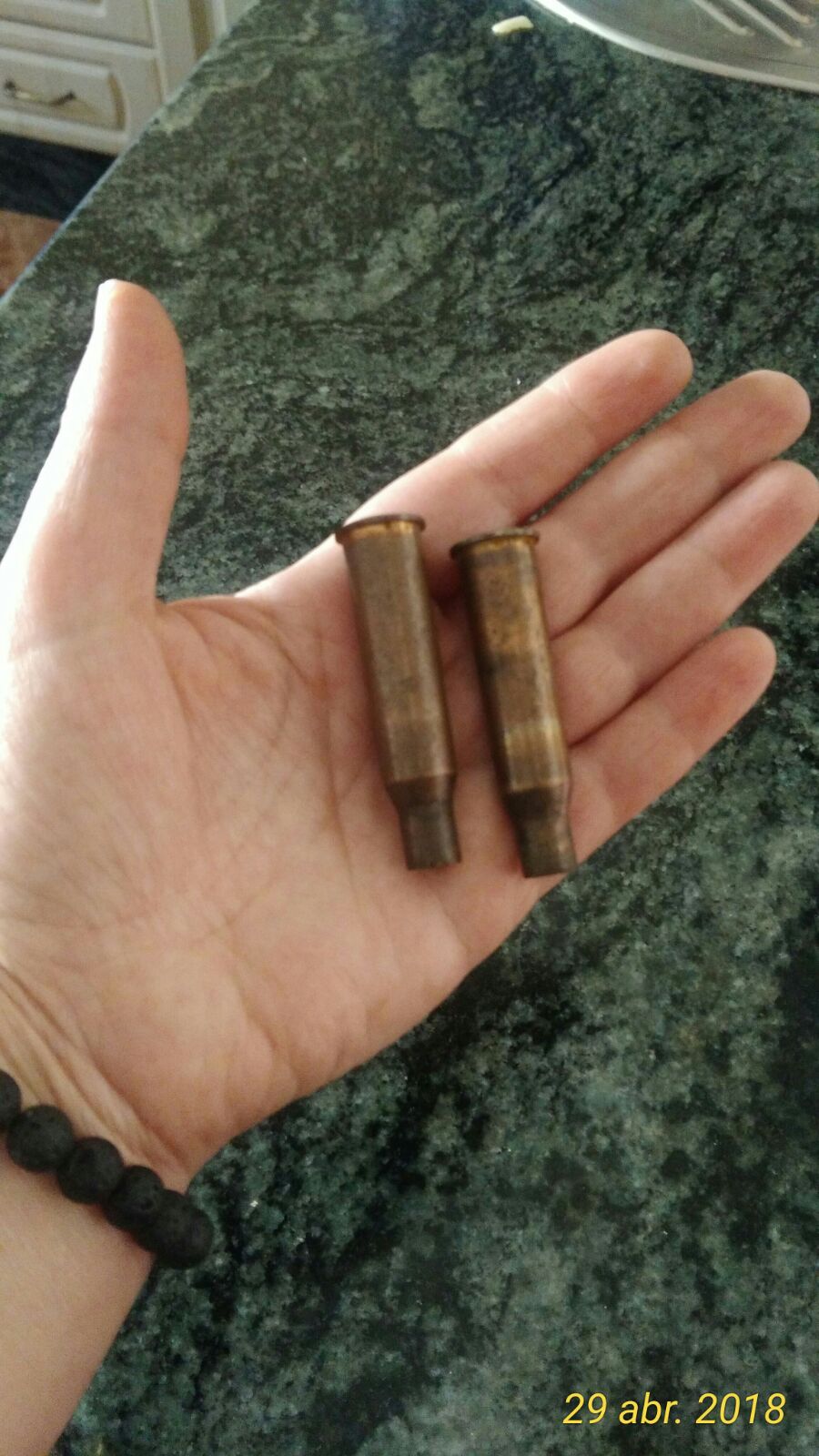 En las fotos colgadas no se ve absolutamente nada porque está todo desenfocado, deberías repetirlas y que se vean bien las marcas del culote de ambas vainas. Sólo con lo que tú dices y sin medidas, es casi imposible aventurar nada, salvo que probablemente pertenecen a un fusil o carabina de repetición manual (llevan reborde).