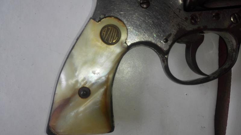 Amigos Buenas noches, considero que esta es la cereza del pastel, esta es un arma sin identidad, perteneciente a un amigo, es un arma que le dio un tío y la misma perteneció al abuelo del mismo, el me cuenta que esta arma tiene mas de 100 años y que siempre a estado guardada, no tiene municiones y ni siquiera se sabe que calibre es, ya que la misma no tiene ninguna identificación, solamente la de la cacha que es una circunferencia y se lee azul y un numero creo que es el serial que es 36, si 36 muy pequeño seria relativamente de las primeras en su tipo, pensé que era calibre 38 pero la munición es muy grande y no es 22 porque es muy pequeña, seria como algo intermedio pero realmente no tengo idea, considero que esta arma es un verdadero desafió, un reto, para los GURU de este foro, ya que identificar el arma y año de fabricación es realmente complicado con tan poca información, considero que el conocimiento es Basto en este Foro y realmente me han dejado sorprendido con lo extenso del mismo y creo que esta arma si que tiene respuesta pero estoy seguro que no sera fácil...
