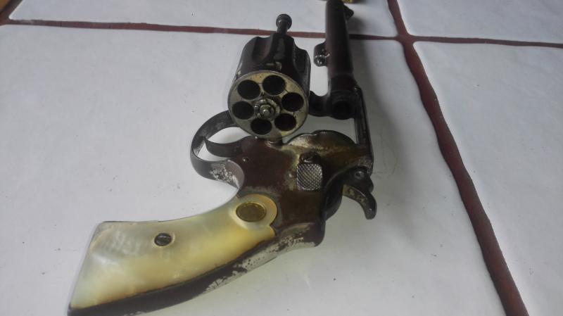 Amigos Buenas noches, considero que esta es la cereza del pastel, esta es un arma sin identidad, perteneciente a un amigo, es un arma que le dio un tío y la misma perteneció al abuelo del mismo, el me cuenta que esta arma tiene mas de 100 años y que siempre a estado guardada, no tiene municiones y ni siquiera se sabe que calibre es, ya que la misma no tiene ninguna identificación, solamente la de la cacha que es una circunferencia y se lee azul y un numero creo que es el serial que es 36, si 36 muy pequeño seria relativamente de las primeras en su tipo, pensé que era calibre 38 pero la munición es muy grande y no es 22 porque es muy pequeña, seria como algo intermedio pero realmente no tengo idea, considero que esta arma es un verdadero desafió, un reto, para los GURU de este foro, ya que identificar el arma y año de fabricación es realmente complicado con tan poca información, considero que el conocimiento es Basto en este Foro y realmente me han dejado sorprendido con lo extenso del mismo y creo que esta arma si que tiene respuesta pero estoy seguro que no sera fácil...